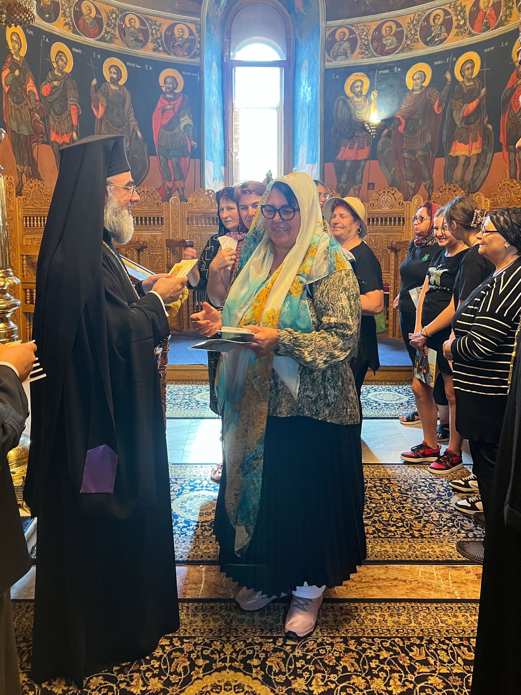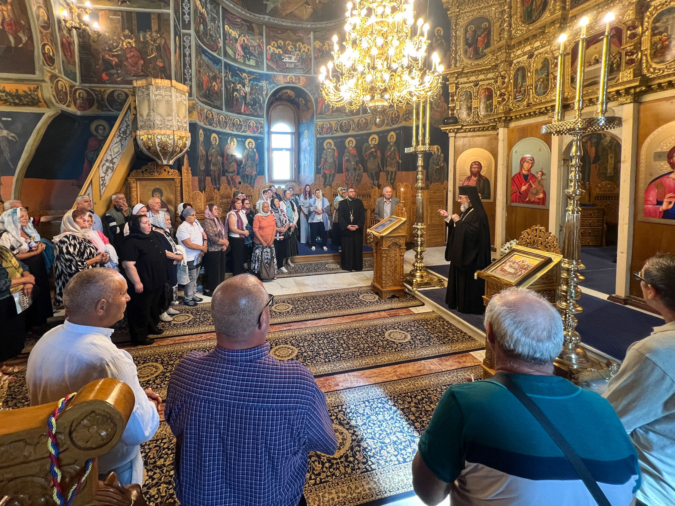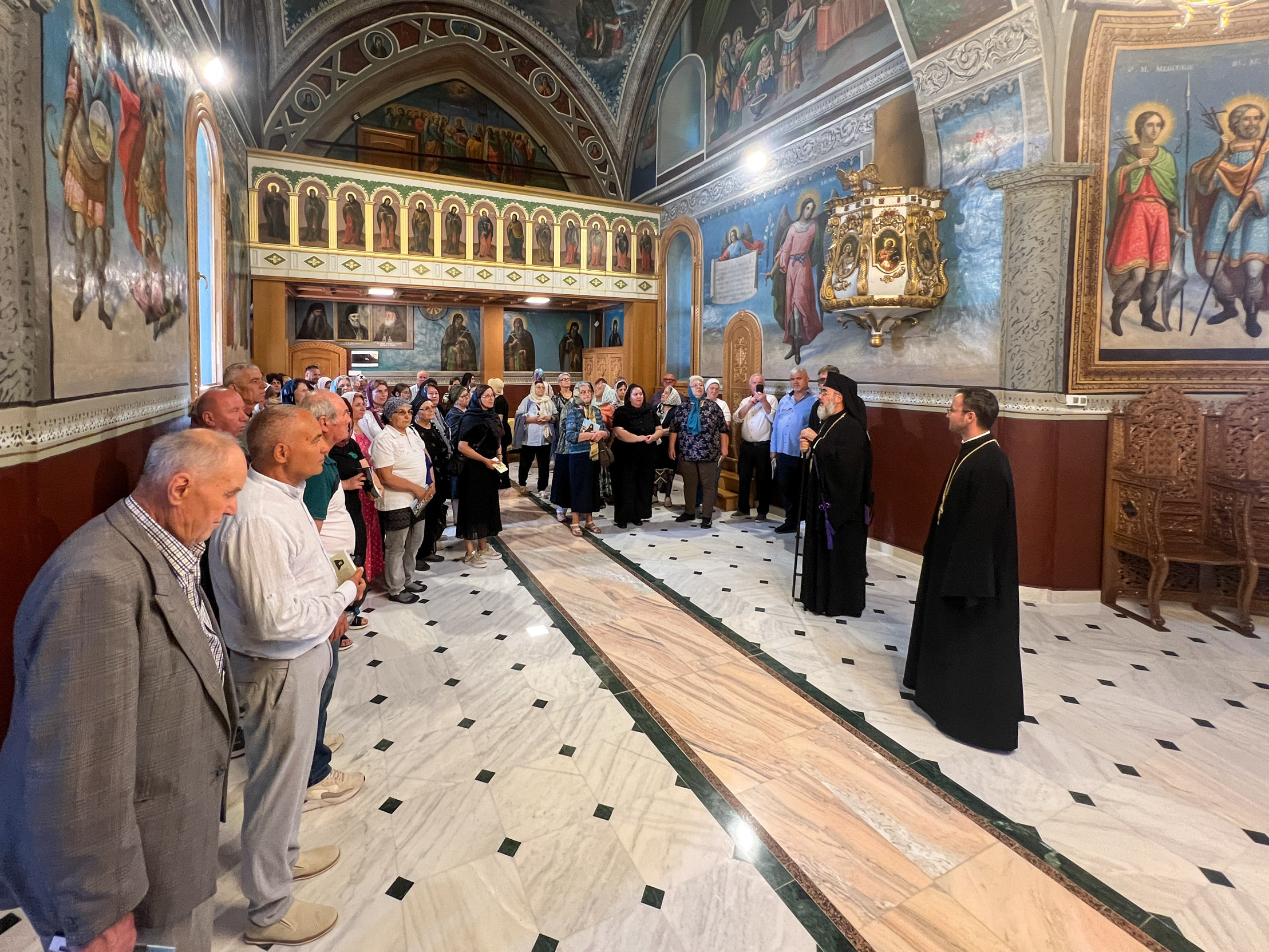 Pelerinii au poposit mai întâi la Catedrala Arhiepiscopală „Înălțarea Domnului”, unde au fost întâmpinați de părintele consilier Dan Necula, care le-a prezentat istoria lăcașului de cult și le-a împărțit iconițe. În continuare, au vizitat Muzeul Bisericesc Eparhial, iar apoi au fost primiți de Înaltpreasfințitul Părinte Ciprian în Catedrala Voievodală „Adormirea Maicii Domnului”. Cu acest prilej, Ierarhul le-a adresat un cuvânt de binecuvântare și de încurajare, dăruindu-le cărți de rugăciuni și broșuri religioase.